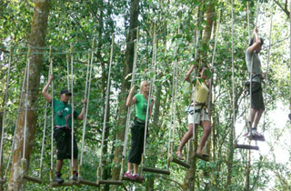 Terayun – ayun diatas ketinggian pepohonan! Bagi mereka yang berani melakukan Tarzan Jump akan dapat menikmati Flying-Fox sepanjang 160m. Dengan tantangan seperti: